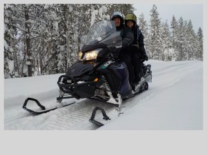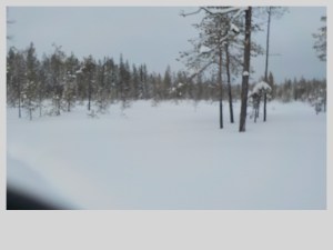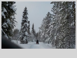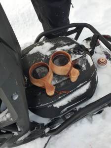Rob, een ervaren motorrijder, is zo solidair om hélemaal uit de bocht te vliegen. Hmm, 2 sneeuwscooters vast in de sneeuw. Met vereende krachten, onder leiding van Rob: “Een twee pull! Een twee pull!”, krijgen we de zware jongens weer op het goede spoor. Daar drinken we warme bessensap op. En verder maar weer, het bevroren meer over waar je het water onder je hoort.