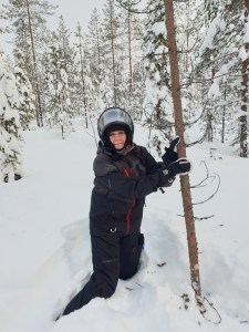 Na sinds tijden echt lekker geslapen te hebben worden we blij wakker. We zijn in Lapland en er wacht een waanzinnige dag op ons. We ontbijten als waren we vorsten. Dan aankleden wat niet simpel wat aantrekken is. Nee, lagen, je moet in héél veel lagen de kou trotseren. Ondergoed, daarna thermo ondergoed, loopshirt, fleecetrui, 2 paar sokken, winterlaarzen, een thermopak, col, bivakmuts, 2 paar wanten en een helm. We gaan met Rob en Agnes rijden op elektrische sneeuwscooters. Laura, onze gids geeft instructies hoe we elektrische sneeuwscooters moeten besturen. Daar gaan we. Waanzinnig mooi hier! Bochten maken is zwaarder dan verwacht. Vergt kracht. Bart rijdt het eerste stukje en daarna ga ik los in een stille witte ijskoude wereld. Wat een sensatie! Na wat lastige bochtjes en heuveltjes volgt een S bocht en net als ik denk dat ik dat verdorie nog aan toe heel goed doe verlies ik de controle en eindig ik opzij gekieperd in de diepe sneeuw.