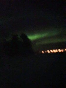 Het dessert is bijna op als de AuroraAlert gaat. Snel, het noorderlicht is te zien! Ik spring op in totale euforie en trek Bart mee. We moeten naar het meer, vooruit! Op dat moment begint de bediening over hoe laat we willen ontbijten. Wegwezen! Ik duw haar net niet ruw opzij, mompel wat over aurora borealis, race naar onze kamer voor jas, muts, wanten en maak Bart bloednerveus omdat hij echt moet opschieten. Kom op nou, soms is het licht er maar enkele minuten, hop hop tempo! Bart vergeet zijn handschoenen, extra trui en bevriest bijkans maar ik sta te springen van blijdschap. Ik zie het noorderlicht. Okee, niet het allersterkste licht maar een kniesoor wie daar op let. De telefoon stopt ermee door de kou, Bart is half bevroren en we gaan terug naar de kamer. Ik straal van oor tot oor en zie dat ik het servet van de eetkamer heb meegenomen. Een half uur later rennen we weer naar het meer. Nóg een alert. Wat heb ik toch vaak geluk. Ik heb het noorderlicht gezien. Het moet niet gekker worden.