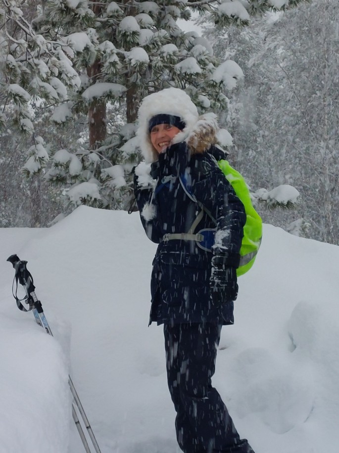 Vandaag gaan we sneeuwschoenwandelen in het Pyhä National Park. Met gids Laura en Rob en Agnes zijn we met 5, we hebben er allemaal zin in. Met “Hé Ho, Hé Ho, je krijgt het niet cadeau” stappen we de sneeuw in. De lucht is grijs, het sneeuwt steeds harder, de wereld lijkt zwart wit. Prima toch!