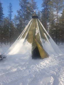 We stoppen bij een Lapse tippi, een Laavu. Binnen warmen we ons aan een houtvuur en genieten van soep met brood, die ochtend gemaakt door Anu. Ze vertelt enthousiast over haar leven. Vragen als hoeveel rendieren ze heeft of hoeveel grond wordt als zeer onbeleefd in Lapland ervaren. Dat zijn typisch vragen die Nederlanders stellen. Oeps, gelukkig stelden Bart en ik ze niet! Ze sommeert ons i.v.m. haar kinderen alles op te eten want: “mam, wij willen niet steeds de restanten moeten eten.” Verder: “Het is ook vrijdag en dan mogen ze snoep kopen en hamburgers.”
