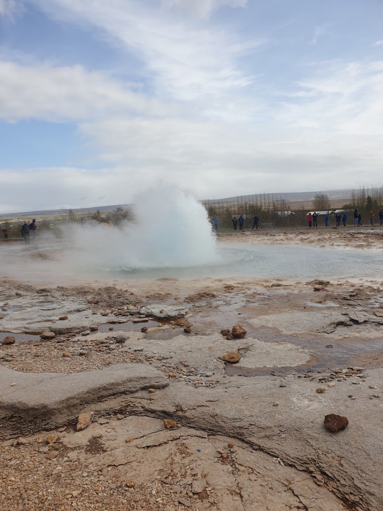 We rijden weer verder voor het, wat mij betreft, pièce de resistance. Een echt werkende geiser te zien die onverwacht het water de lucht in schiet. Mijn wens wordt vervuld. De Strokkur heeft ca. iedere 10 minuten een erupsie. Soms zelfs twee vlak na elkaar en de ene keer hoger dan de andere keer. Het is een prachtig schouwspel. We blijven heel lang kijken tot mijn vingers bevroren zijn en mijn telefoon leeg, Tijd om op te laden.