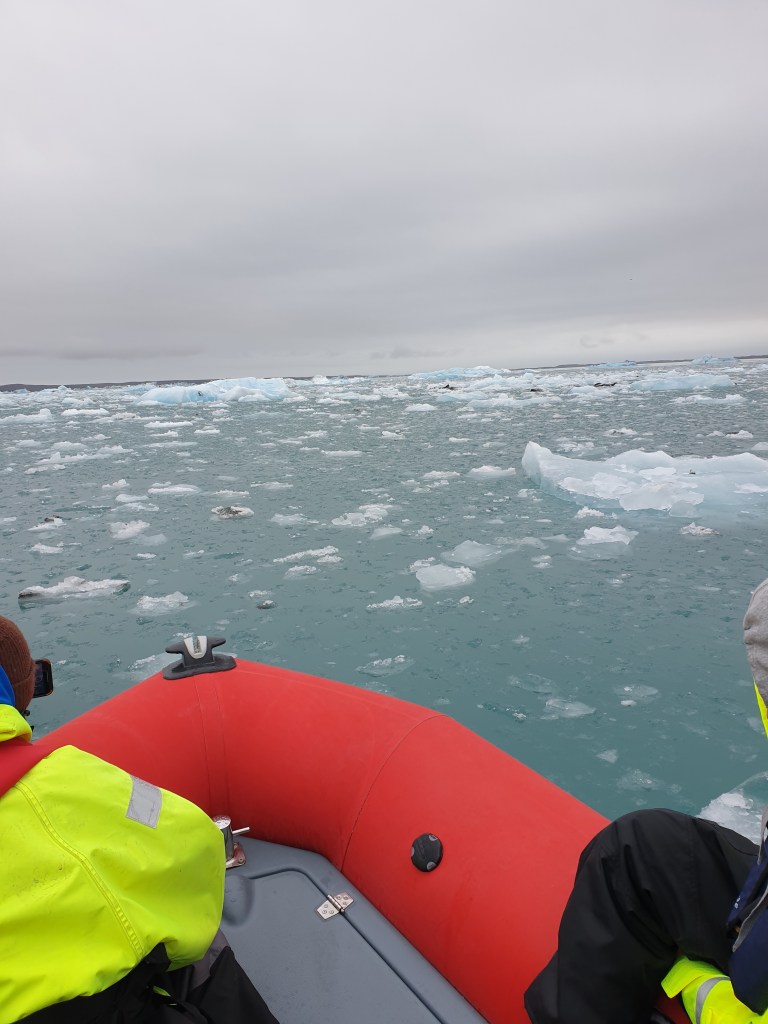 We glijden langs enorme stukken ijs, grillig van vorm en verschillend van kleur. Sneeuwkorrels bevriezen en ontdooien continu en worden door de gletsjers samengeperst tot gletserijs. Het persen gaat door tot het ijs blauw is. Hoe blauwer het ijs, hoe groter de kracht waarmee het werd samengeperst. IJsbergen steken maar 10% boven het water uit, 90 % zit onderwater. Van de gletsjers breken steeds stukken af. Als een brok ijsberg draait is het ijs dat eerder onder water zat fel blauw. Na één dag boven water wordt het door de zuurstof al wit. Sommige schotsen zijn zwart door de lava. De stukken die afbreken gaan door de stroming langzaam richting de open verbinding met zee.