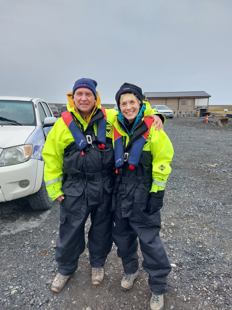 Vanmorgen gaan we een tocht per zodiac maken over het gletsermeer Jökulsárlón. Het miezert een beetje maar het is perfect weer voor de tocht. We trekken de enorme pakken aan met de reddingsvesten. Ik weet uit ervaring dat ze nooit mijn maat hebben maar dit pak is wel érg groot en wijd. Maar wel lekker warm en ik hobbel 500 meter als een kruising van kabouter Plop en een sumo worstelaar naar de zodiac en probeer niet te kijken naar het touwtje met de rode knop dat bengelt aan het reddingsvest. Wat is dat toch, als je ervan af moet blijven wil je juist des te meer toch eraan trekken.