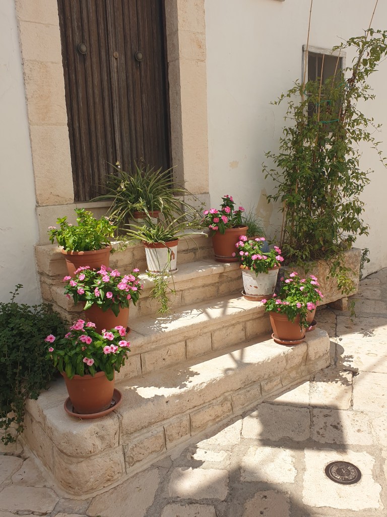 Eerlijk gezegd worden we een beetje moe van de hoeveelheid plaatsen die we de laatste tijd bezocht hebben. Plaatsen waar je graag het nodige wilt zien. Het leuke van Locorotondo en het volgende plaatsje Cisternino is dat er juist géén dingen zijn om te bekijken. Hier kan je heerlijk ronddwalen door smalle autovrije straatjes. Alles is hier wit, de stenen van zowel de huizen als die van de straten. Wanneer je in een winkelstraat een willekeurig zijstraatje inslaat is het het mooist. Het is er stil, de geluiden zijn direct verstomd en waar je ook kijkt, overal staan potten met planten. Op ieder hoekje, op de traptredes en in hangbakken aan sfeervolle balkonnetjes. Mooier kan niet.