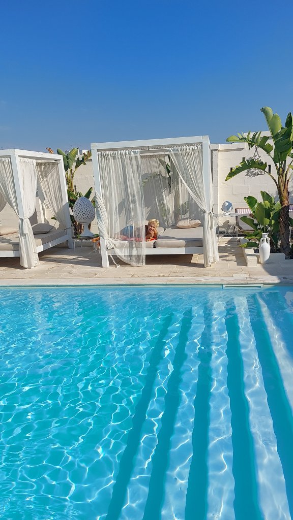 Het is warm, we rijden door naar Fasano naar ons verblijf voor de komende nachten. Verrassend is dat Masseriola Antiche Fogge midden in de stad ligt, op loopafstand van het oude centrum. De Maseriola ziet er prachtig uit. De kamers liggen om het zwembad waar allerlei sfeervolle en confortabele zitjes zijn gecreëerd. Werkelijk prachtig.