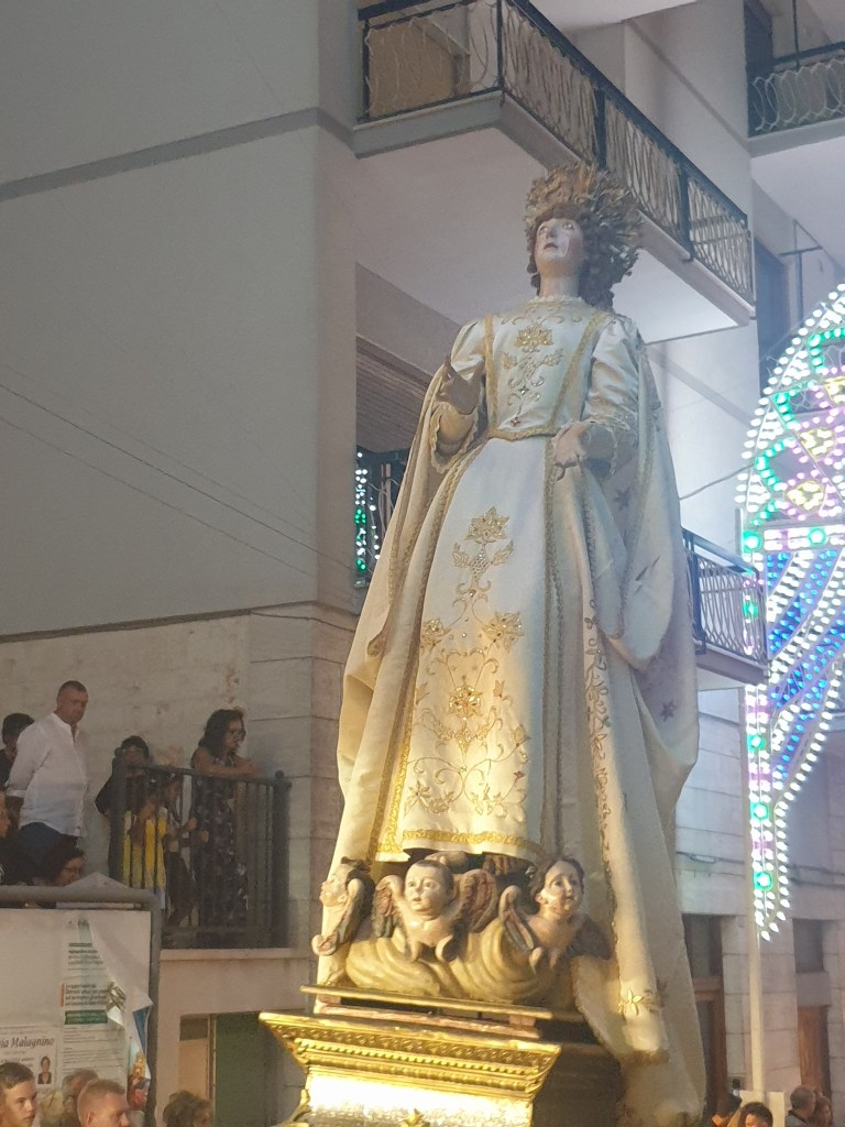 We vinden warempel nog een mooi plekje op een terras waar we wijn met lekkere hapjes bestellen. De processie komt hier precies langs, bofkonten zijn we. Maria wordt op de schouders gedragen van sterke mannen maar zelfs zij moeten iedere keer afgewisseld worden. Maria is blijkbaar nogal zwaar. Ze brengen Maria veilig terug in de kerk waar ze weer een jaar kan bijkomen van alle tumult. Er volgt nog een bescheiden vuurwerk van misschien drie minuten. De mensen roepen ohh en ahhh en als het voorbij is gaan ze luisteren naar de straatartiesten. Of nemen hun kinders mee naar de kermisattracties of gaan de marktkraampjes af. Er hangt een warme gezellige sfeer zonder enige wanklank. De drie heren Polizia Municipale slaan hun dorpsgenoten op de schouder, praten bij met de buurvrouw en aaien de kinderen over hun hoofd. Wij krijgen een hoofdknik met bella serata. En dat is het zeker, een mooie avond.