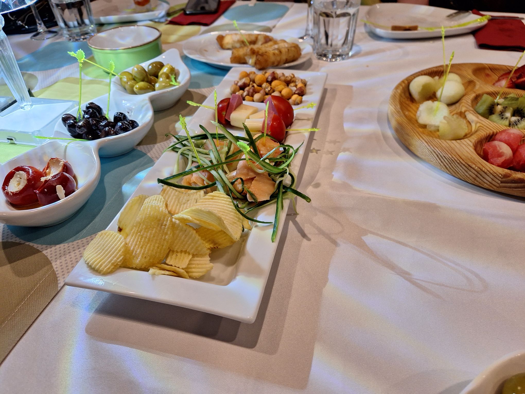 Onze eigen kapitein Stubing die hier Halil Danaci heet verwelkomt ons samen met nog vier bemanningsleden aan een tafel vol lekkernijen. Hadden we wel genoeg gegeten onderweg? Jazeker en de net weggewerkte snicker, Sultana en twee bounties zorgen ervoor dat ik niet veel trek meer heb maar gelukkig compenseert de rest van de groep mijn eetgedrag.