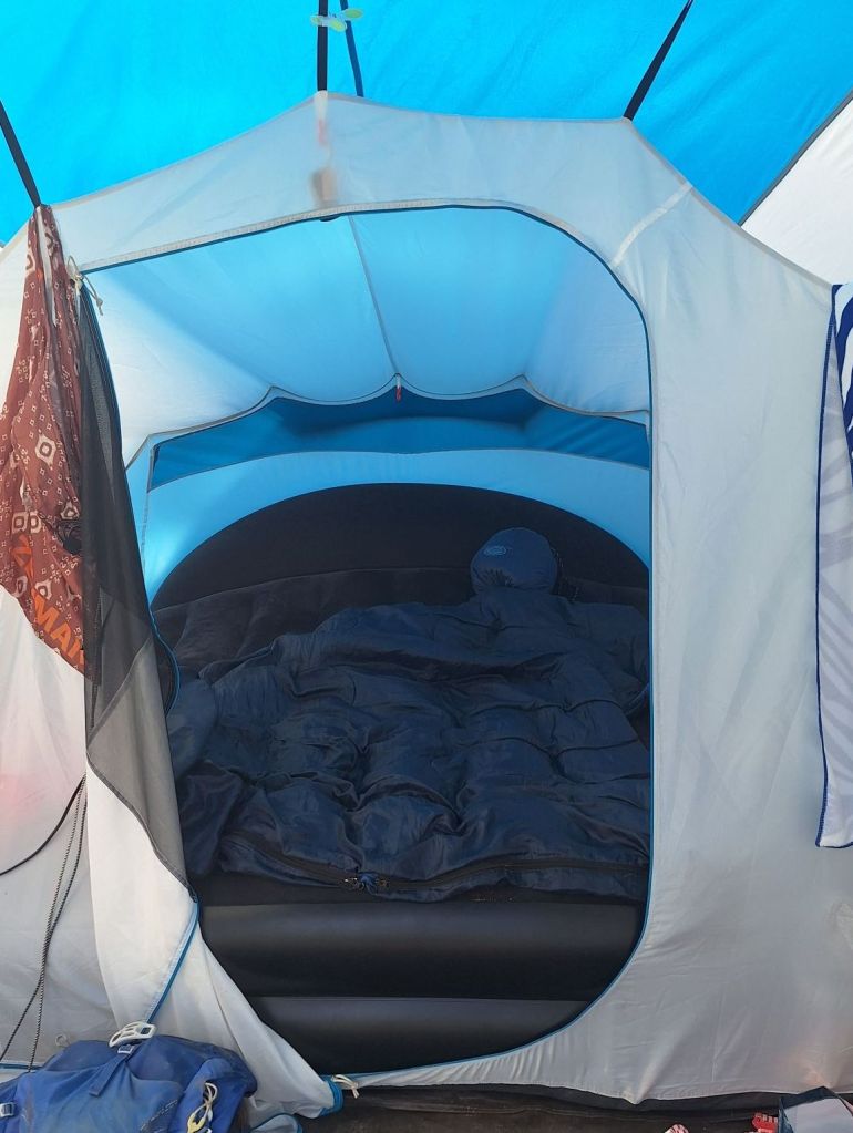 Terug bij de tent zien we dat ons mooie tweepersoonsluchtbed een steeds vreemdere vorm aanneemt. Het hoofdeinde wordt almaar groter en dikker. Nog even en we slapen rechtop in bed. Komt vast door de warmte, het begon gisteren al maar nu is het bizar.