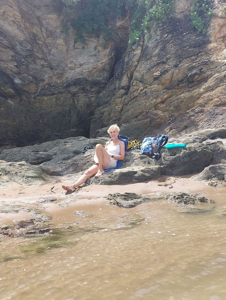 We lopen op blote voeten 10 kilometer in de branding langs het strand. Heerlijk ontspannend en je krijgt er ook nog zachte voeten van. Het is hier opvallend rustig. Geen idee waarom maar badgasten komen hier pas in de loop van de middag. Er zijn hele stukken zandstrand maar ook rotsen met prachtige baaien ertussen. We vinden een lief baaitje voor ons alleen, zoeken schelpen en lunchen met meegebrachte baguette en kaas. Het smaakt ongelooflijk lekker. Dit is echt leven als God in Frankrijk.