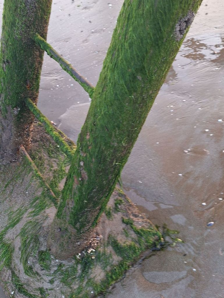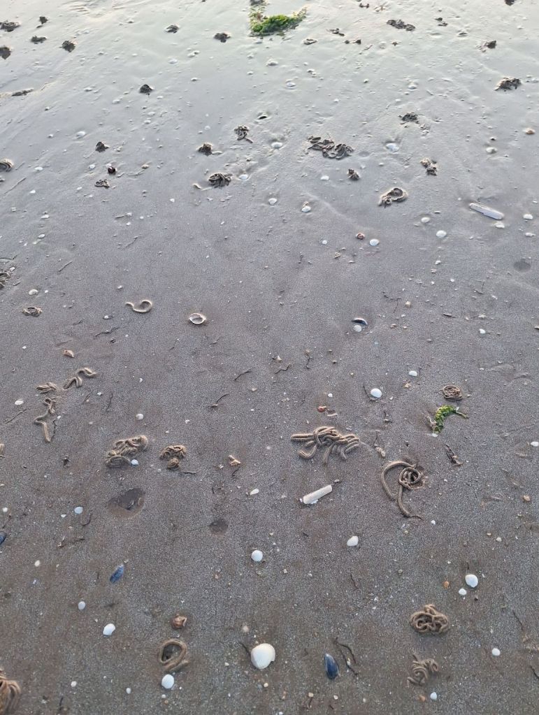 We maken nog een prachtige wandeling over het strand. Het is eb en het is voor het eerst dat we om de vissershutten kunnen lopen. Het drooggevallen stuk strand laat hele trossen schelpen zien zoals ze in de zee bij elkaar groeien. Samen zijn we sterker geldt ook onder water. Er zijn krabbetjes, honderden gaten van de wormen, hier en daar een dode vis maar nergens een kwal. Goed zo, die mag ik niet!