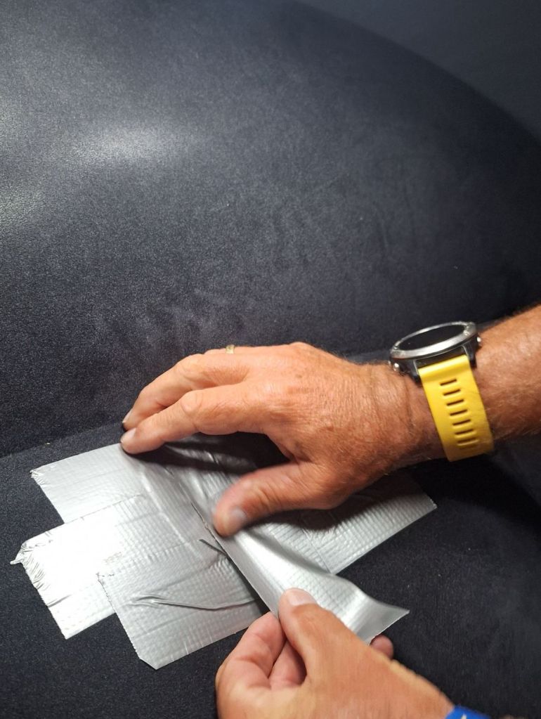 Ik plak er een blarenpleister op van Compeed, er dient actie ondernomen te worden. Even is het stil en dan doet de pleister wat hij op de bijsluiter belooft. Hij ademt en laat lucht door. We plakken er duck tape op en nog meer duck tape en nog meer duck tape maar het luchtbed blaast reddeloos zijn zwanenzang tot er een plat omhulsel over blijft. We moeten er om lachen. ‘Ik dacht echt dat hij het nog wel drie dagen zou redden maar het is wat het is. Platvloers.’