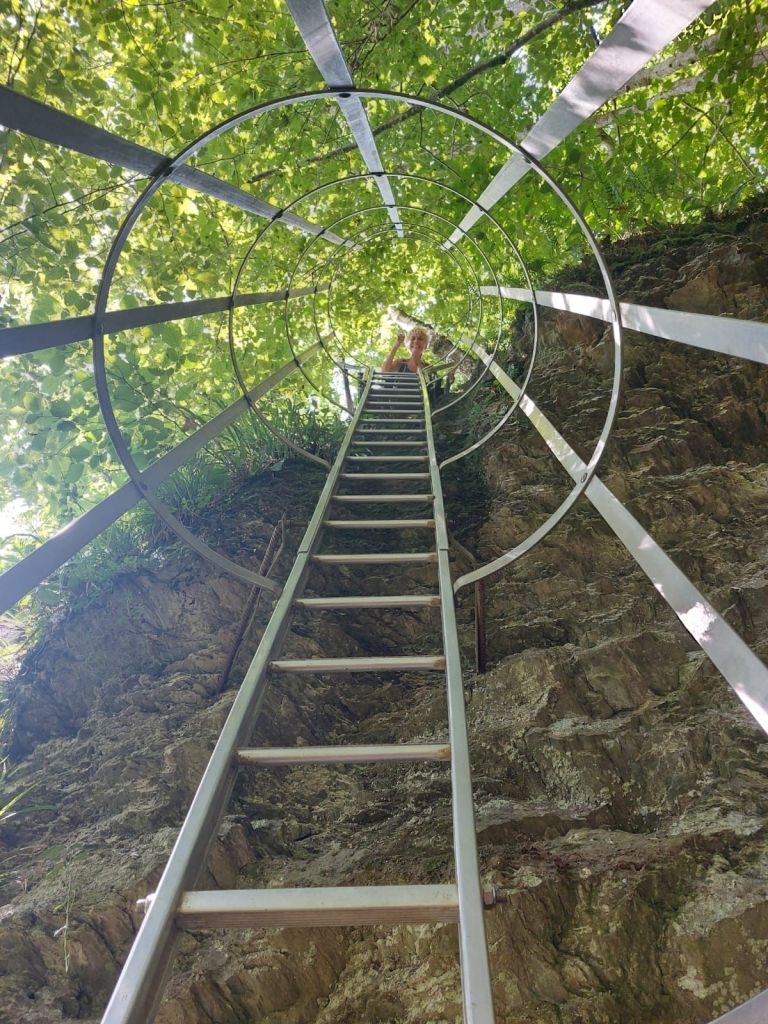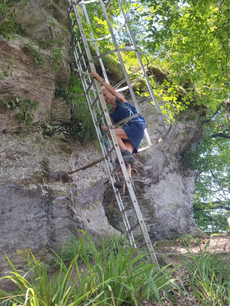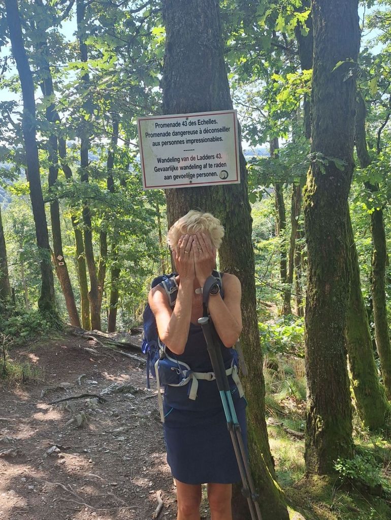 We gaan vandaag de laddertjeswandeling bij Rochehaut lopen, die tocht is de reden dat we deze camping boekten. De route start op slechts vijf kilometer hier vandaan en staat al jaren op mijn verlanglijstje. Met dat gekke lijf dat steeds stijver wordt wil ik deze tocht niet uitstellen. De tocht heet eigenlijk les échelles de Rochehaut maar niemand noemt hem zo. Het pad bestaat al heel lang als ontsnappingsroute naar schuilplaatsen tussen de rotsen. De inwoners van Rochehaut gebruikten de ladders om zich voor de Nazi’s te kunnen verstoppen. Na de oorlog werd het een onderdeel van lange afstandswandelingen zoals de GR16. Tien jaar geleden werd de route gedeeltelijk gesloten omdat het te gevaarlijk was en er zelfs twee dodelijke slachtoffers vielen maar na flinke investeringen in 2015 is het gelukkig weer toegankelijk.