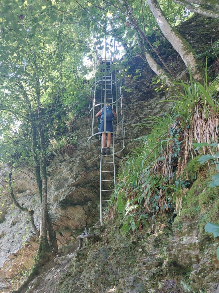 We klauteren over boomwortels naar boven en weer naar beneden. Zonder wortels is lastiger, dan kan je glijden. We klimmen over rotsen om helemaal boven te komen én om weer naar beneden te komen. Er zijn op een aantal punten metalen trapleuningen geplaatst en vier keer een metalen laddertje. De begroeiing wordt dichter en de uitzichten alsmaar mooier. Je kunt de route heel goed met af en toe een korte rust binnen de drie uur lopen. Gevaarlijk vind ik hem niet maar begrijp de waarschuwingen goed, zeker bij nat weer. De rotsen zijn dan spekglad.