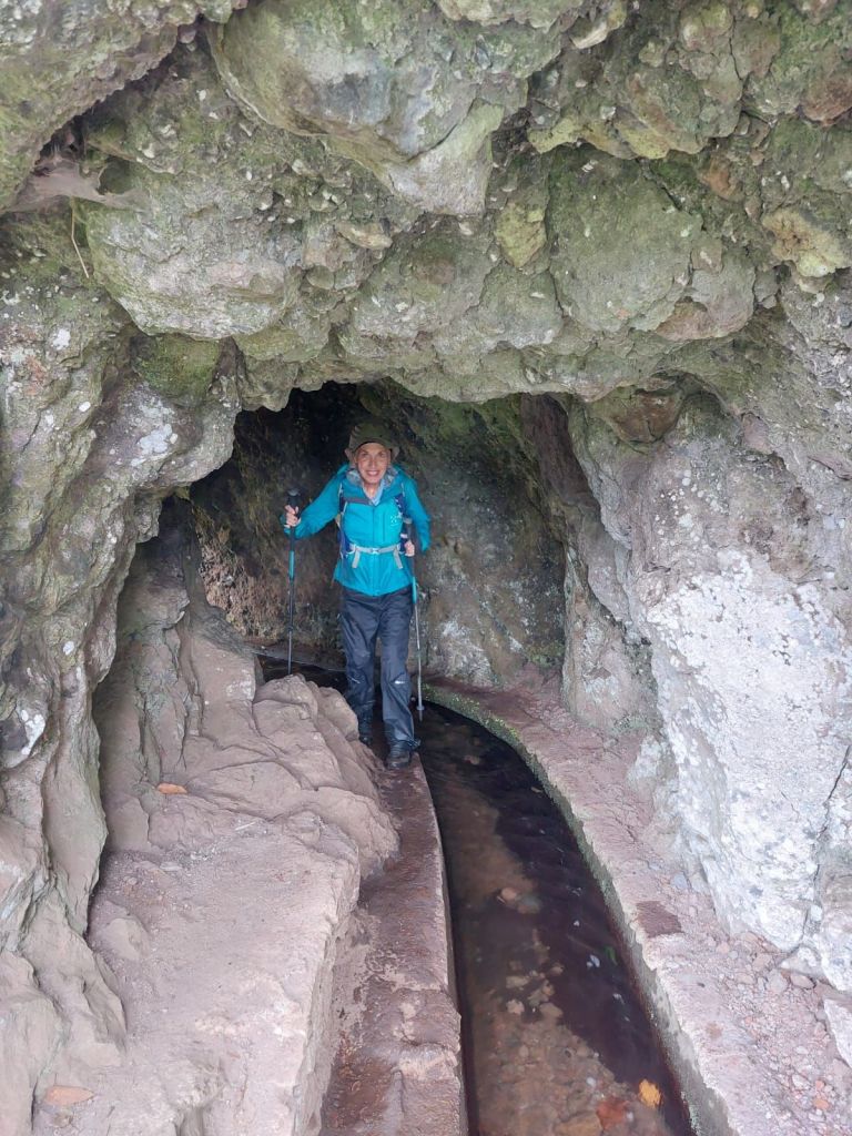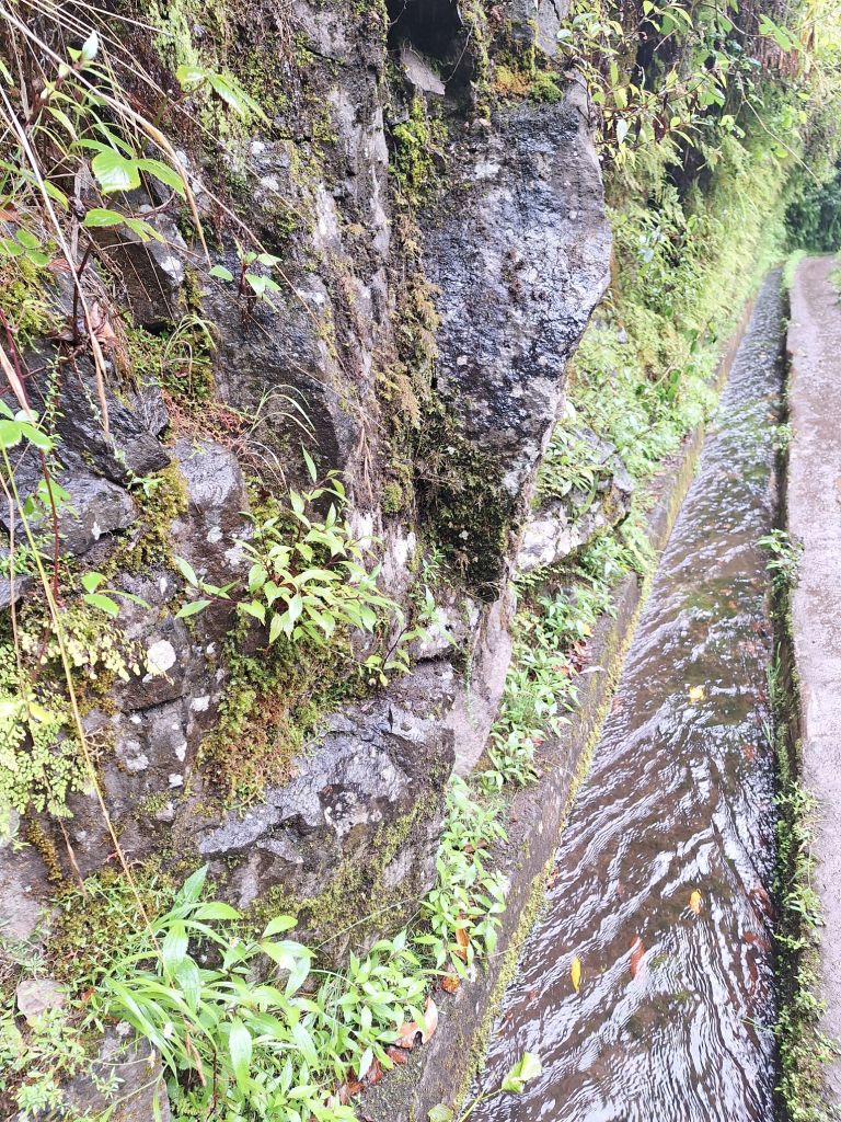 We lopen langs de levada wat lastig is want regelmatig staat het er blank. We lopen ook langs laurierbomen. Dit type bos heeft een oude oorsprong en is afkomstig uit de Ijstijd van Noord-Afrika en Europa. Hier kwam vóór de Ijstijd een type bos voor met bladeren die altijd groen bleven. Door de geringe afstand konden veel planten de eilanden koloniseren. We lopen door een tunnel en langs een waterval waarbij we vlak langs de rotswand lopen om niet door de grote stralen kletterend water geraakt te worden en nog enigszins droog verder te lopen.