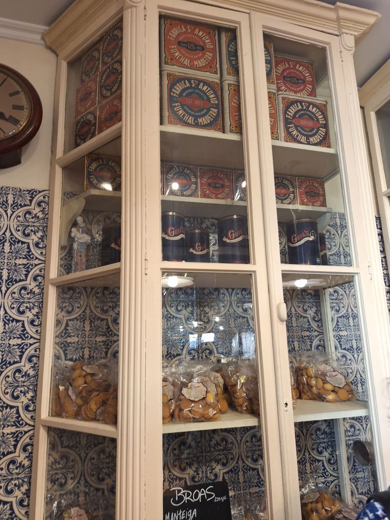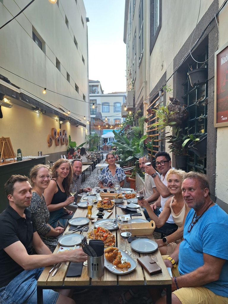 We komen 10 minuten voor aanvang van de tour aan en gaan met gids Anna en nog zes andere mensen op stap. Het zijn heel leuke mensen. Vier uit de United States en twee uit Duitsland. We hebben een geweldige avond. We beginnen op de markt, proeven fruit wat eruit ziet alsof het van onbekende planeten komt, eten de lekkerste koekjes uit een piepklein winkeltje, smullen van chocolade en later warme cakejes met custardvulling met kaneel, drinken de lekkerste wijnen uit Madeira en proeven traditionele drankjes. We schuiven in een klein straatje aan een lange tafel aan en eten vis en vlees en groentes en kaas klaargemaakt zoals de Madeirianen het leerden van hun voorouders. Daarna lopen we nog naar een locatie voor de perfecte Poncha of Nikita en eindigen in een gezellige wijnbar waar we de wijnen van dit eiland proeven met nog meer kaas en noten en hapjes. Toevalligerwijs is er net een fotograaf die opnames maakt voor een nieuwe website van de wijnbar. Hij maakt een hoop foto’s van ons. We staan er in ieder geval heel blij op.