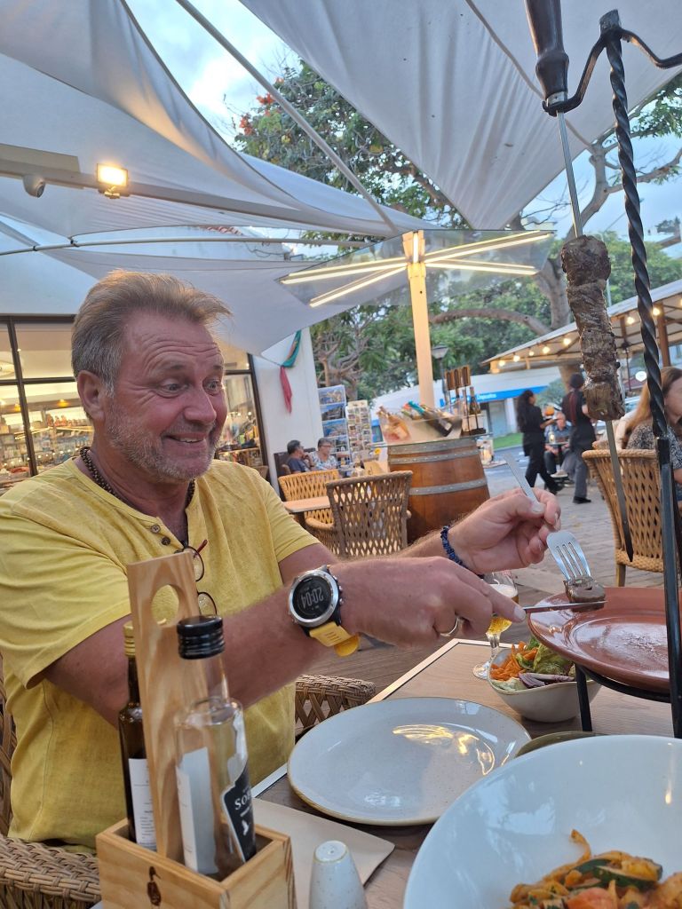 Gisteravond aten we in een heel leuk restaurantje vlakbij het hotel waar een zanger met akoestische gitaar voor een extra dimensie zorgde. Hij zong heerlijke liedjes van CCR, Pink Floyd, U2 en Simon and Carfunkel. De sfeer kwam er blijkbaar voor zowel de restauranthouder als de zanger compleet onverwachts goed in, de zanger genoot zienderogen van zijn succes en de baas had een glimlach van oor tot oor die de hele avond bleef. De pauze van twee keer tien minuten ging terug naar twee keer 3 minuten. Het hele terras zong luidkeels mee met ‘Sweet Caroline.’ Het viel niet mee om daarna de lange trappen weer op te gaan naar ons hotel. Er staan zelfs bankjes aan de zijkant van de trap zodat een hotelgast daar uit kan puffen op weg naar de top. Ik zit daar als ik de slappe lach krijg van de gekke capriolen die Bart uithaalt om boven te komen. De avond op het terras heeft ook hém niet onberoerd gelaten.