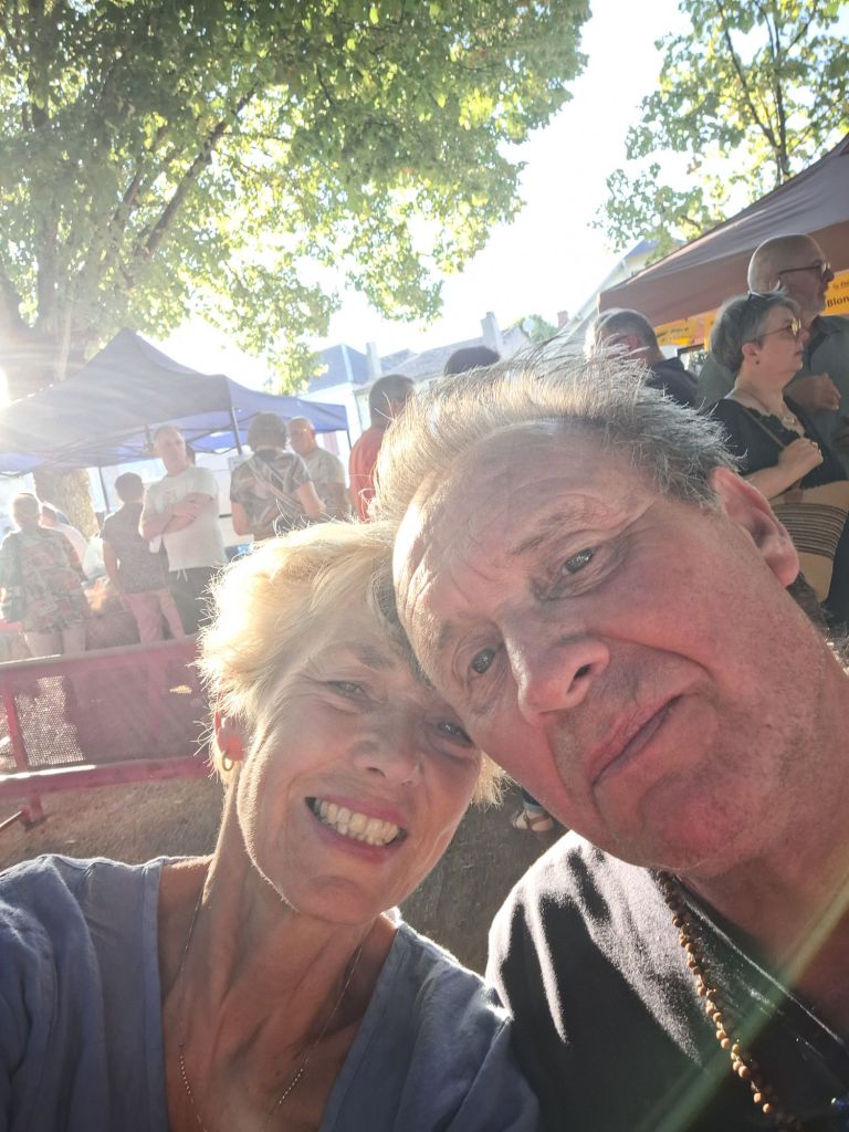 We zetten de tent op (wat is dat toch makkelijk bij deze tent), en rijden in vijf minuutjes weer terug naar het centrum van Airvault. Daar is een dorpsfeest. Er zijn allerlei wijnboeren en kraampjes met vlees, vis, artisanaal bier, wafels, crêpes, oesters, streekgerechten et cetera en er staan heel veel lange tafels met banken. Het hele dorp is uitgelopen. Je dient je eigen glas en bord mee te nemen en je kiest uit de vele kraampjes wat je wilt eten en drinken. De prijzen zijn schappelijk. Uiteindelijk smult Bart van een bord vol gebraden eend, lokale groentes en eenden paté en zit ik heel gezellig te praten met een jonge lokale boer die paté maakt, zijn vriend uit België die voor hem komt werken en zijn ‘copain’, de grote liefde van de patémaker die geiten houdt en uit Bordeaux komt maar voor de liefde hierheen kwam.