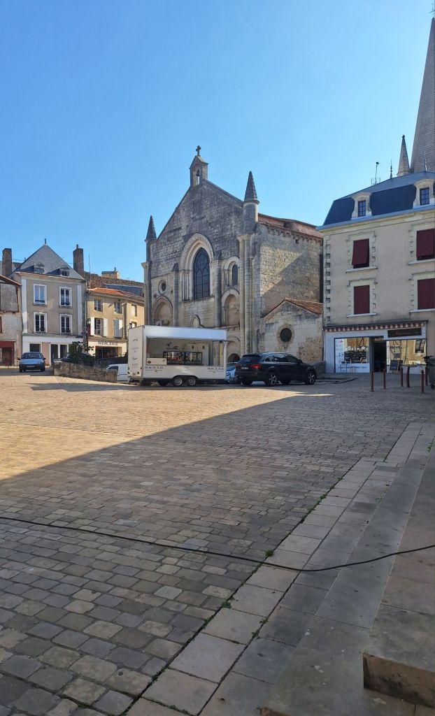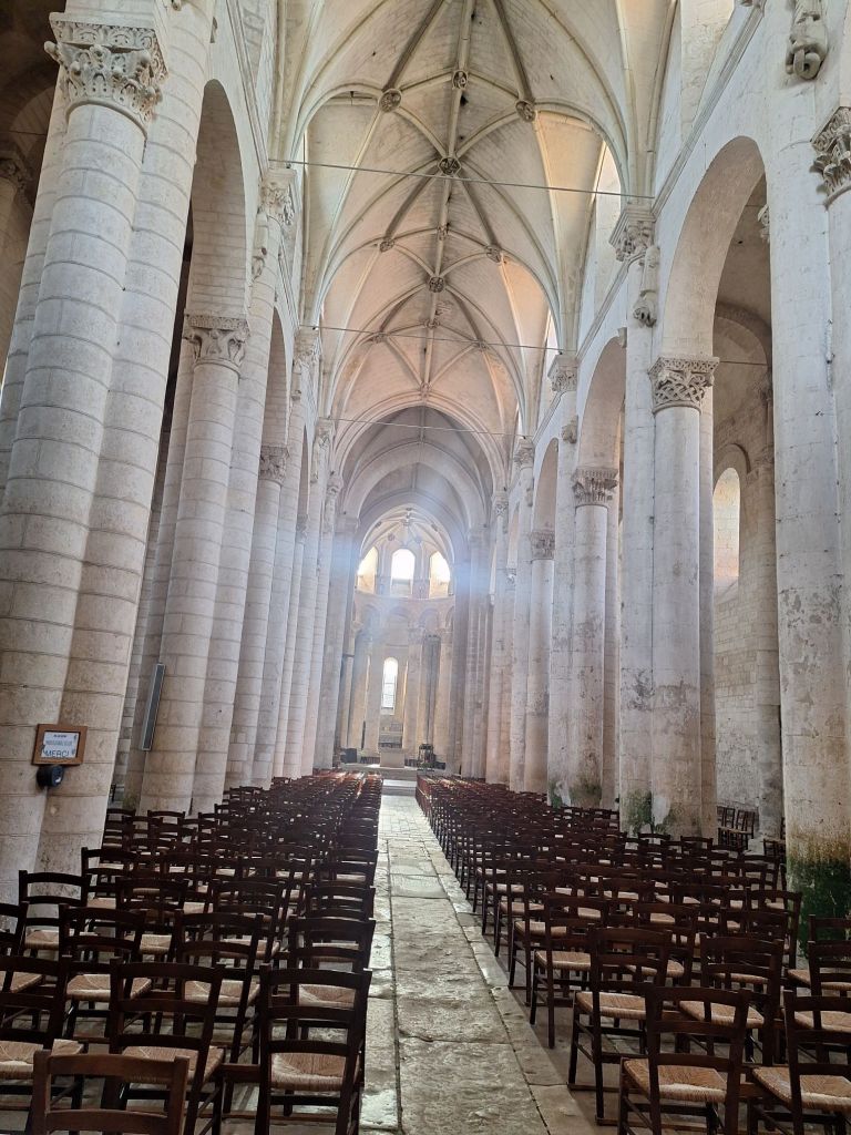 Het is heerlijk wakker worden met de zon in Airvault, hier kan er iedere dag buiten ontbijten worden. Genieten met een grote G. Ik wil vanmorgen graag naar het centrum van het stadje want daar is de weekmarkt. We nemen een flinke tas mee, want je koopt toch altijd net wat meer, en op naar Place Saint Pierre waar de markt moet staan. Niet te missen in het stadje is de prachtige abdij met de naam Saint Pierre. Ooit was dit een belangrijke plek voor veel pelgrims op weg naar Saint Jacques de Compostella. De kerk wordt nog steeds druk bezocht wat je ziet aan het meubilair, er staan ongelooflijk veel stoeltjes klaar. We zien ook een ondergrondse fontein onder het voorplein van de abdijkerk. Die fontein wordt gevormd door het afstromende water van de vlakte erboven. Er gaan verhalen dat er een hele cultus aan deze fontein was gewijd in de tijd van de Romeinen. In die tijd lag de fontein niet ondergronds, de grond steeg ongeveer 50 cm (!) per jaar. Het water lijkt heel helder maar is toch vervuild. Omdat elke wijk later putten kreeg raakte de fontein in vergetelheid en werd in 1890 gesloten. De sleutel van het hek naar de fontein moet je eerst even halen bij het VVV-kantoor er schuin tegenover.