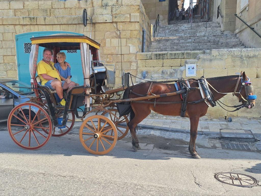 Terwijl ik luister naar de hoeven van Bobby, het paard voor de koets, en vrolijk om me heen kijk zie ik een treintje voorbijkomen met een vrouw die duidelijk naar me aan het wuiven is. Wie zwaait er nu in Valetta naar me? Ik wuif maar terug.