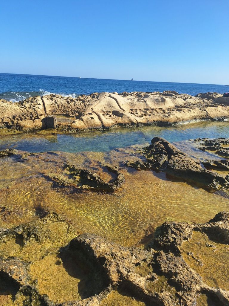 Dit stuk van de kust is rustig, je ziet af en toe iemand lopen. Daar waar de terrassen en winkels zijn zie je op grote rotsen veel mensen die allemaal hun handdoek een mooi plekje willen geven. Ik kan het niet helpen dat ik aan een apenrots moet denken.