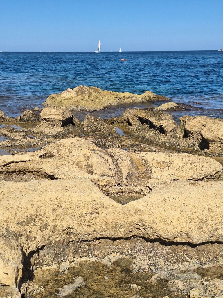 We gaan lekker terug naar de rotsen langs de kust. Weg van de krioelende mensenmassa’s en de drukte in de stad want die ben ik vrij snel zat. We blijven heel lang zitten kijken naar een rotsblok dat eerst nog vrij ligt op het zand maar door het wassende water langzaam rondom omsloten wordt door het zeewater. Ik kan er eindeloos naar blijven turen. Wanneer er in de verte een grote boot passeert worden de golven groter en woester.